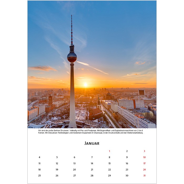 Der Kalender besitzt das Format A3 (297mm x 420mm) im Hochformat. Die Fotos, Grafiken oder das Firmenlogo werden auf weißen Hintergrund gedruckt. Das Titelblatt sowie jeder Monat kann individuell mit einem eigenen Foto und passenden Text versehen werden. Der Kalender wiegt insgesamt rund 600 Gramm und kann daher kostengünstig verschickt werden. Anderes Format gewünscht? Wir bieten den gleichen Kalender in den Formaten 50x70cm, A2, A3 und A4 sowie weiteren Sonderformaten an.